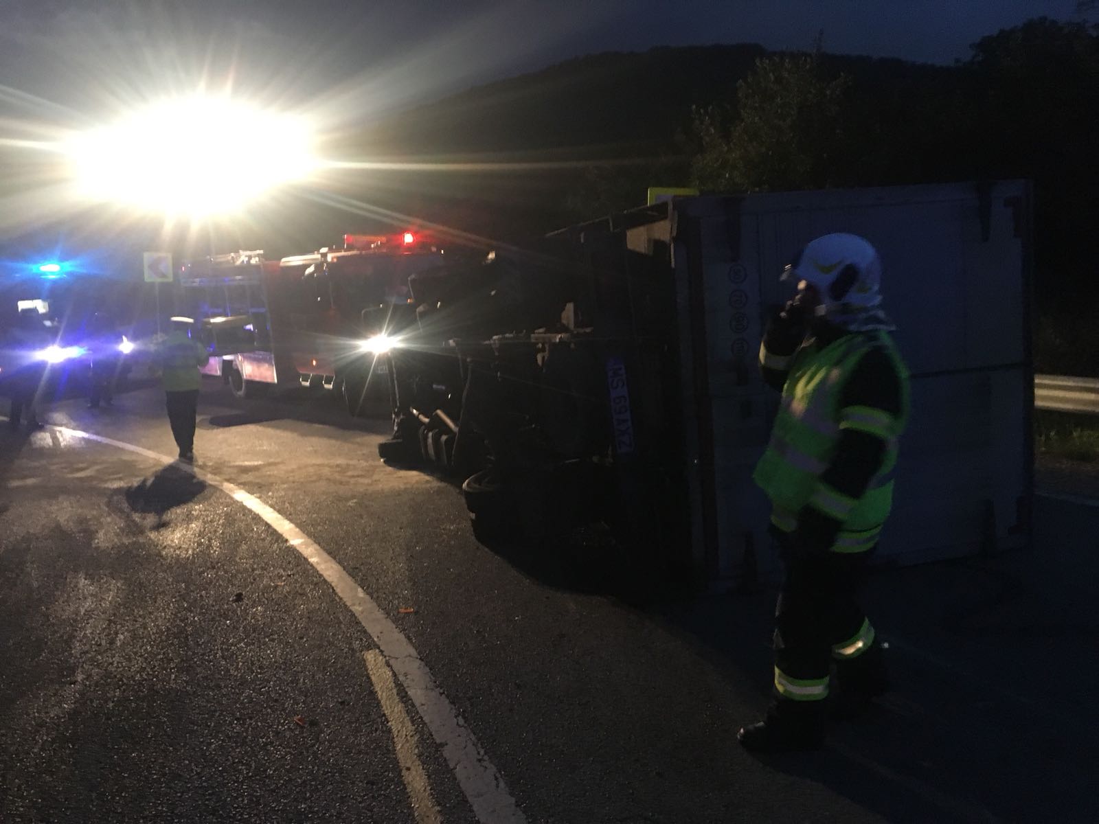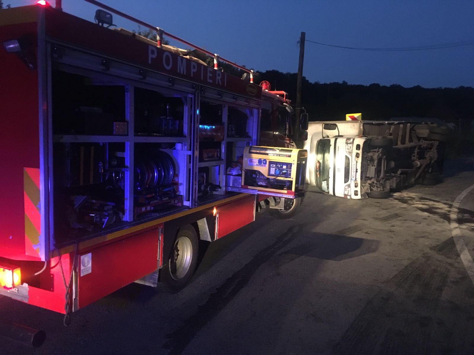 În urma impactului, camionul s-a răsturnat pe șosea, circulația desfășurându-se alternativ, pe un singur sens.