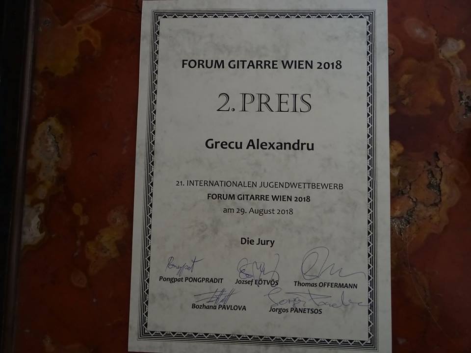 În perioada 23 -29 august, la Viena a avut loc una din cele mai importante competiţii din lume „Forum Gitarre Wien” – Austria. A fost a 28-a ediţie a Festivalului Internaţional de chitara clasică, fără limită de vârstă, şi a 23-a editie a Competiţiei Internaţionale a tinerilor până la 18 ani, concurs care a reunit elita chitariştilor din întreaga lume (Germania, Franţa, China, Italia, Austria, Polonia, Grecia, Turcia, Coreea de Sud, Slovenia, Cehia, Ungaria, România).