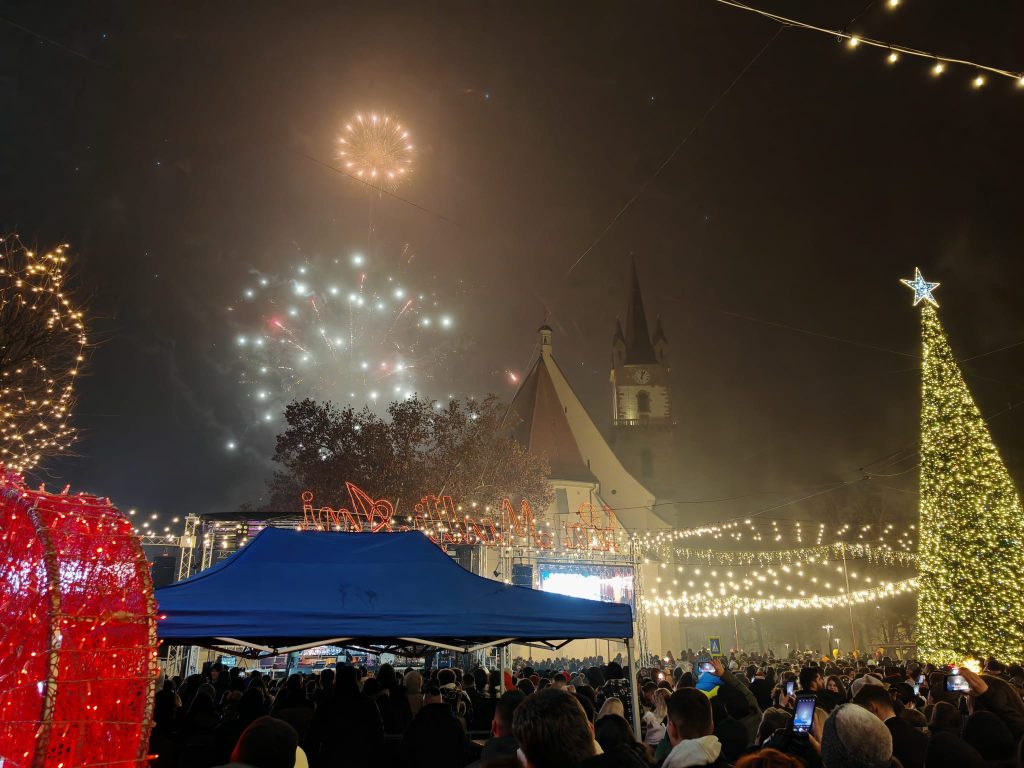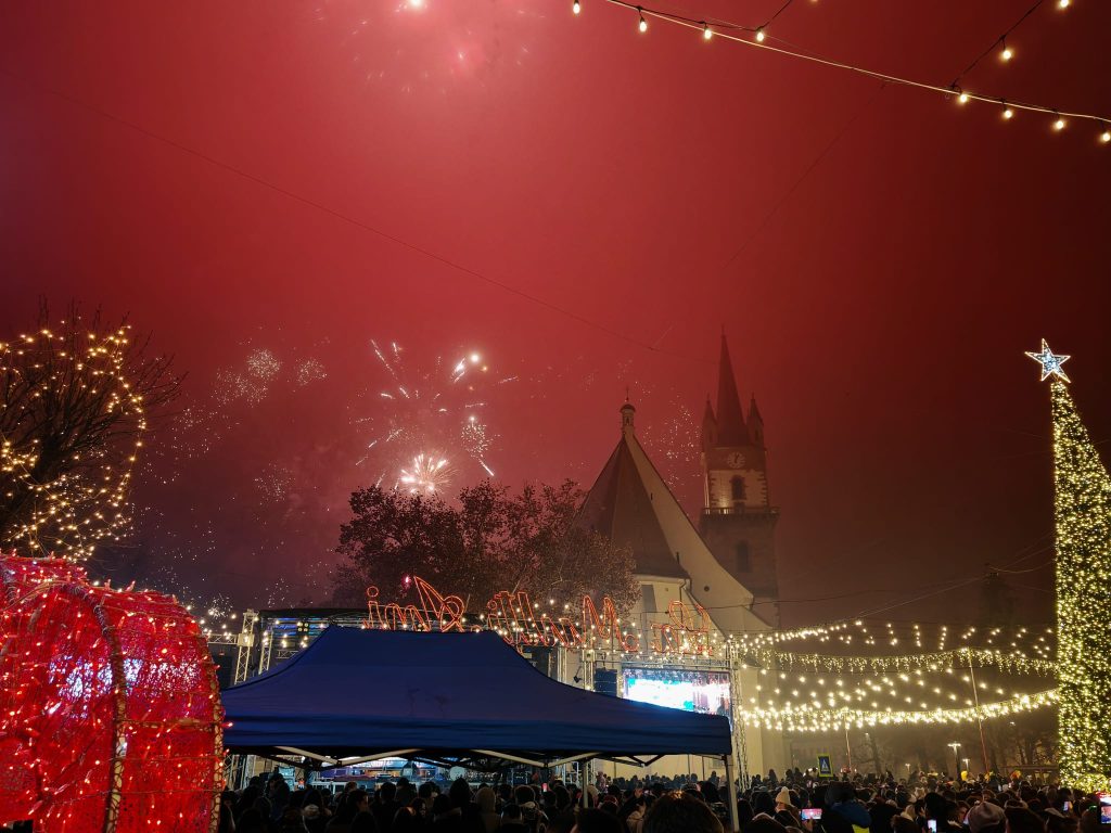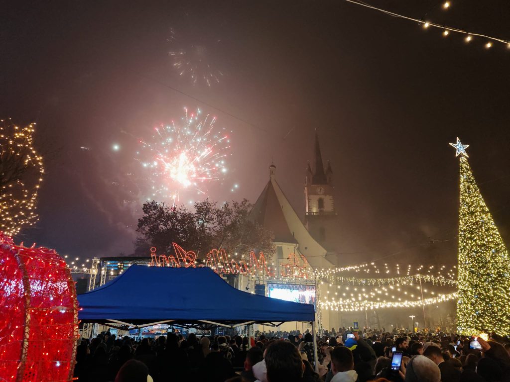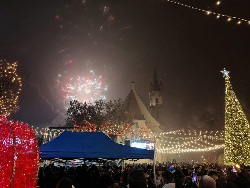 Numeroși bistrițeni au petrecut noaptea dintre ani în stradă, pe pietonalul Liviu Rebreanu din municipiu, trecerea în Noul An 2025 fiind marcată prin focuri de artificii lansate din zona Bisericii Evanghelice și prin momente artistice.