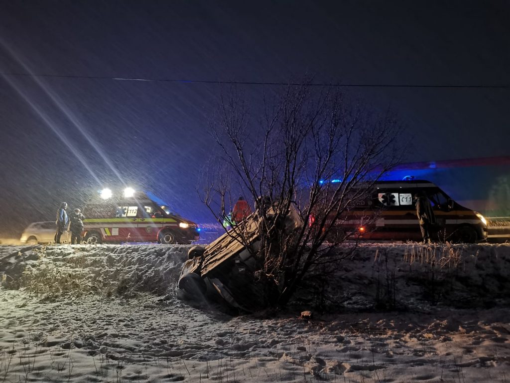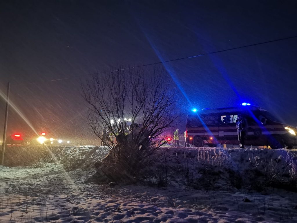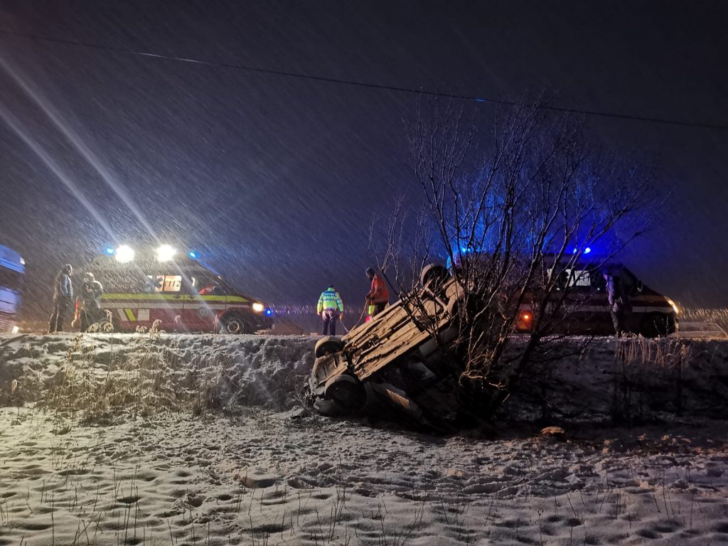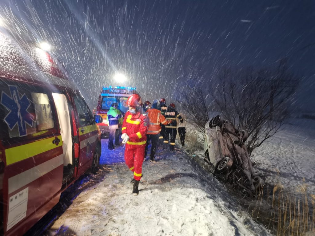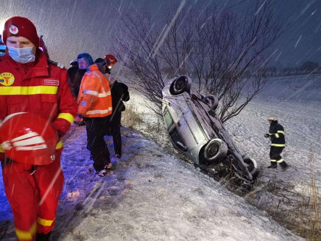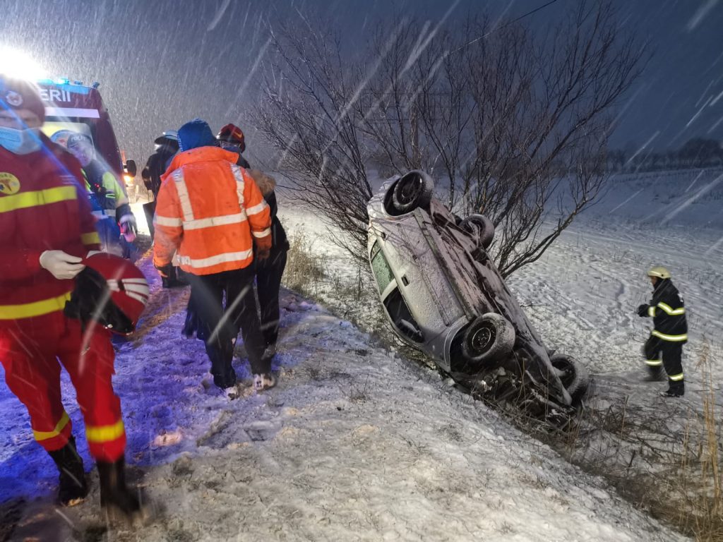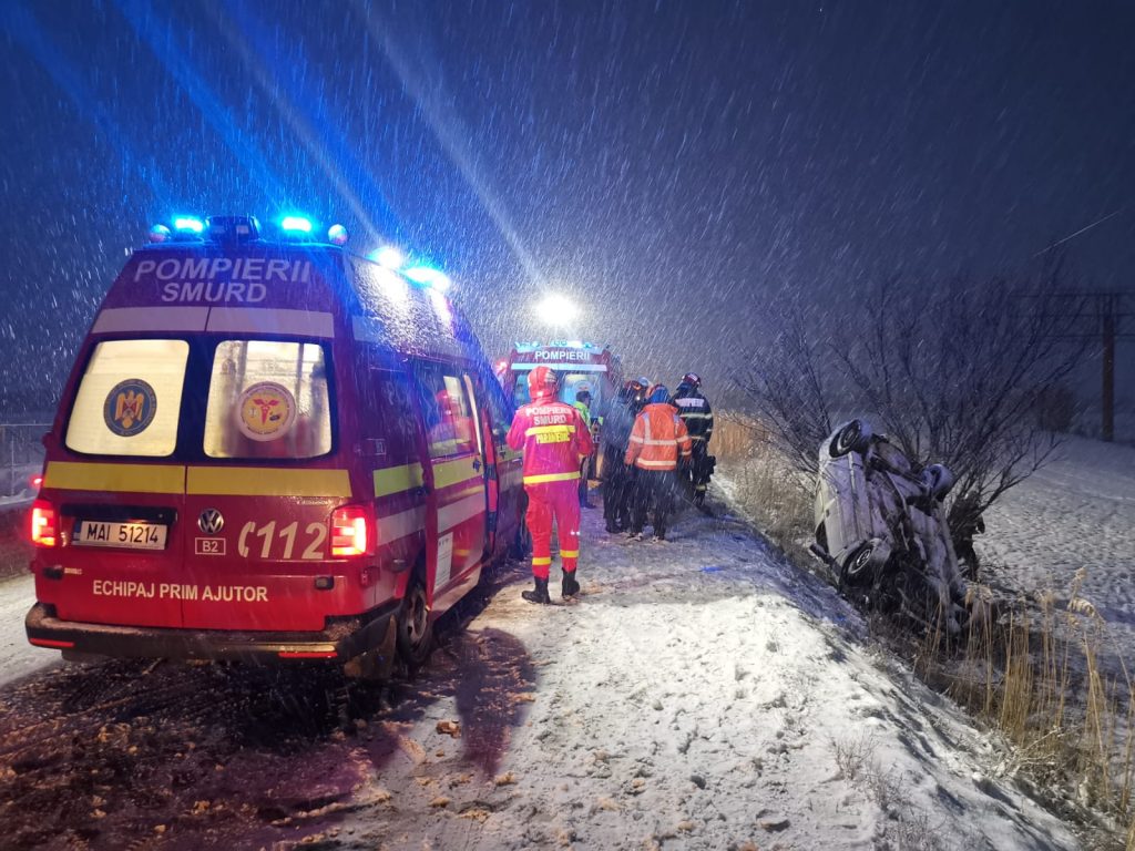 Din primele informații, șoferul unui autoturism a pierdut controlul asupra direcției de deplasare, iar mașina pe care o conducea s-a răsturnat în afara părții carosabile.