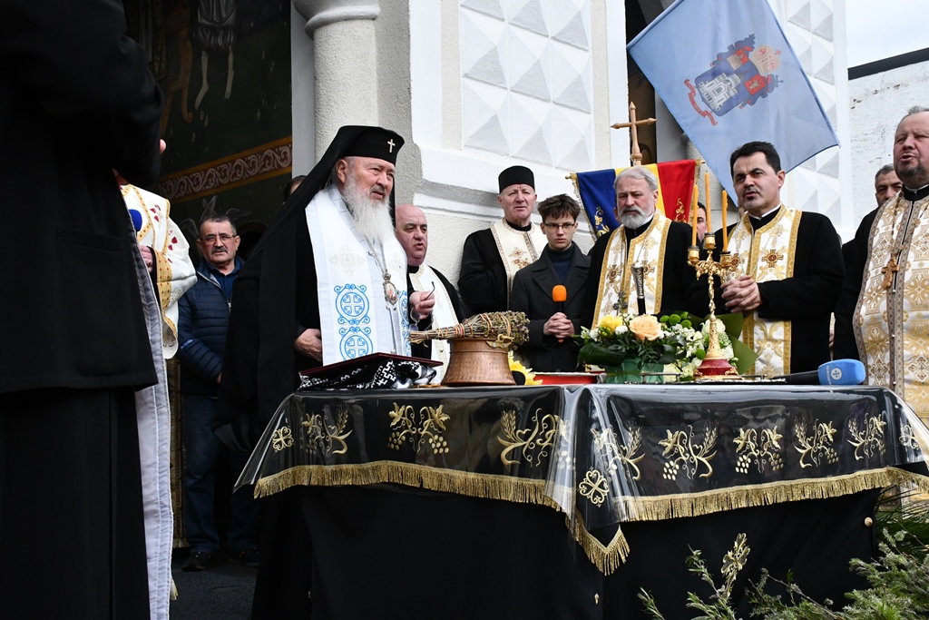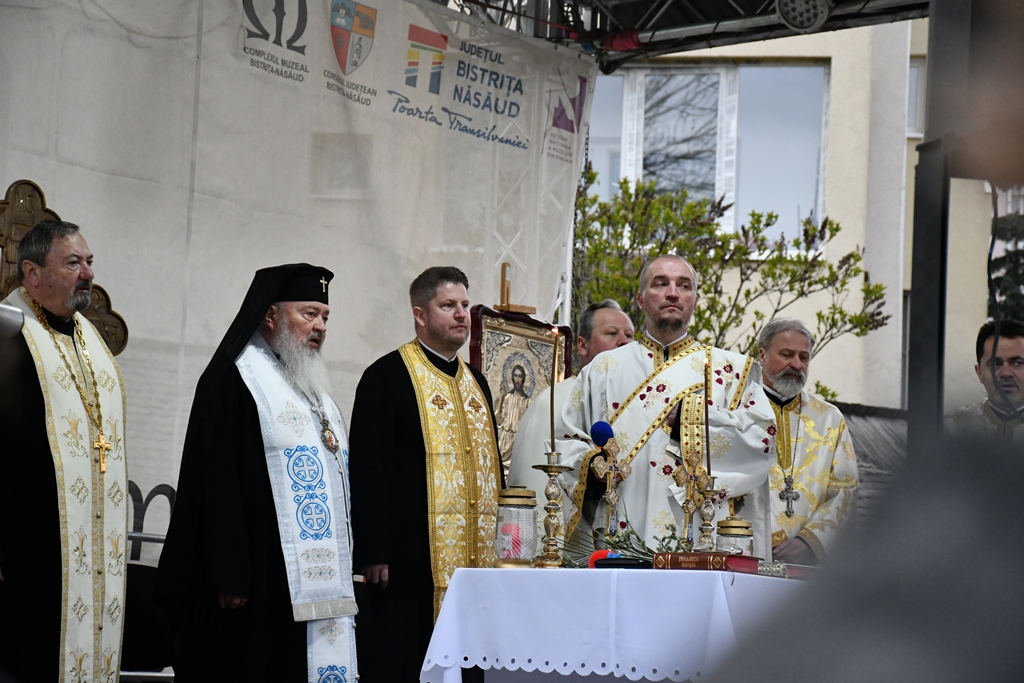 În curtea Complexului Muzeal Bistrița-Năsăud, punctul final al procesiunii, Înaltpreasfințitul Părinte Andrei a oficiat slujba Vecerniei și a rostit un cuvânt de învățătură.