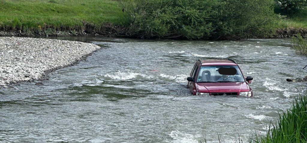 FOTO/VIDEO: Șofer care a încercat să traverseze râul Bistrița cu mașina, scos din apă de pompieri