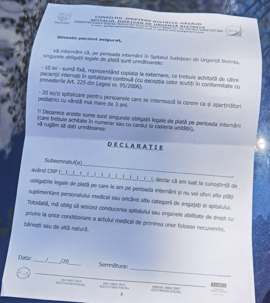 Managerul SCJU Bistrița a reamintit că, încă din anul 2019, pacienţii care se internează în spital dau o declaraţie în scris prin care se angajează că nu vor oferi foloase necuvenite cadrelor medicale, ei fiind informați în mod clar cu privire la sumele care vor fi achitate legal pentru coplată.