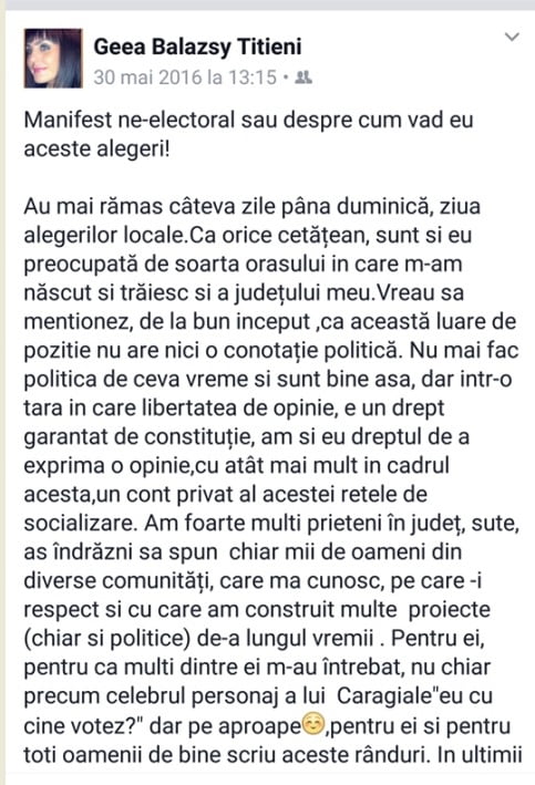 „Au mai rămas câteva zile pâna duminică, ziua alegerilor locale. Ca orice cetățean, sunt si eu preocupată de soarta orasului in care m-am născut si trăiesc si a județului meu.Vreau sa mentionez, de la bun inceput ,ca această luare de pozitie nu are nici o conotație politică. Nu mai fac politica de ceva vreme si sunt bine asa dar intr-o tara in care libertatea de opinie, e un drept garantat de constituție, am si eu dreptul de a exprima o opinie,cu atât mai mult in cadrul acesta,un cont privat al acestei retele de socializare. Am foarte multi prieteni în județ, sute, as îndrăzni sa spun chiar mii de oameni din diverse comunități, care ma cunosc, pe care -i respect si cu care am construit multe proiecte (chiar si politice de-a lungul vremii) .