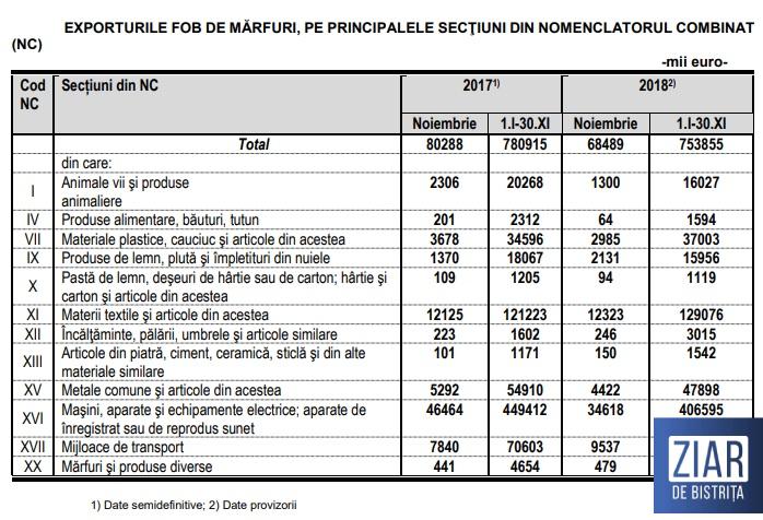 În perioada ianuarie – noiembrie 2018, volumul exporturilor realizate a fost de 753855 mii euro, cu 27060 mii euro (3,5%) mai mic comparativ cu aceeași perioadă a anului precedent.