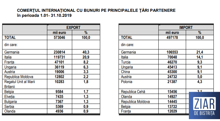 Germania este principalul partener comercial al județului Bistrița-Năsăud, atât din punct de vedere al exporturilor, cât și al importurilor de mărfuri, potrivit datelor publicate de Direcția Regională de Statistică Bistrița-Năsăud.