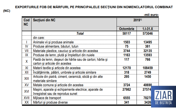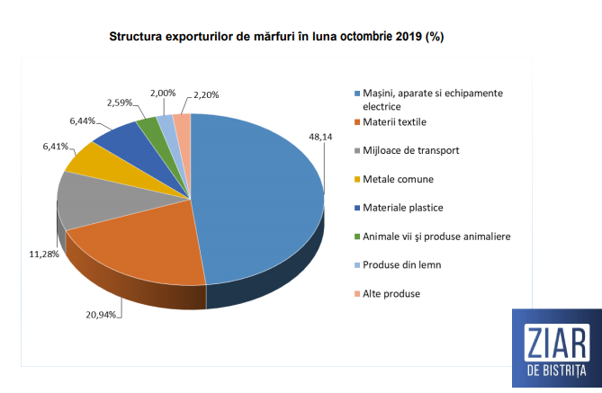 În ceea ce privește exporturile, potrivit datelor statistice, numai în luna octombrie a anului 2019, agenţii economici cu sediul în judeţul Bistrița-Năsăud au realizat exporturi în valoare de 58 milioane euro, cu 21,4%sub nivelul lunii corespunzătoare a anului anterior şi cu 0,1% peste nivelul lunii precedente.