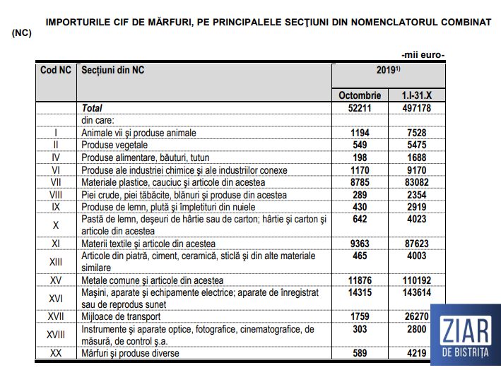 În luna octombrie 2019, volumul exporturilor realizate de agenții economici din județul Bistrița-Năsăud a scăzut cu 21,4% față de aceeași lună a anului precedent, la importuri înregistrându-se de asemenea o scădere cu 27,7%.