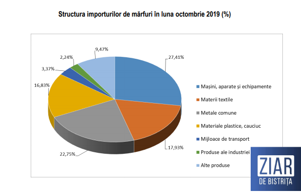 Referitor la importurile realizate de agenții economici din județ, în luna octombrie 2019, volumul acestora a fost de 52 milioane euro, cu 27,7% mai mic comparativ cu aceeaşi lună a anului precedent. Faţă de luna anterioară, volumul importurilor a crescut cu 15,4%.Repartiţia pe principalele ţări partenere a importurilor judeţului în perioada 01.01-31.10.2019 este următoarea: Germania (21,4%), Italia (14,1%), Turcia (9,3%), Ungaria (9,1%), China (9,1%), Austria (5,0%), Polonia (4,3%) şi Republica Cehă (3,1%).