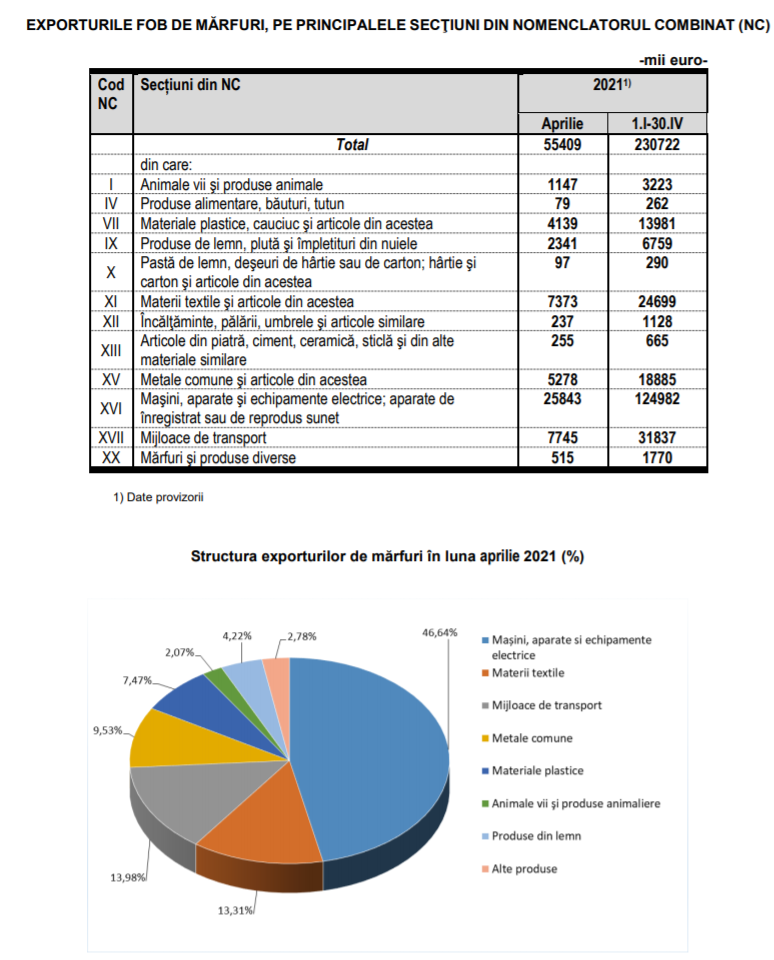 În ceea ce privește exporturile, potrivit datelor statistice, numai în luna aprilie 2021, agenţii economici cu sediul în judeţ au realizat exporturi în valoare de 55,4 milioane euro, cu 244,5% peste nivelul lunii corespunzătoare a anului anterior şi cu 11,0% sub nivelul lunii precedente.