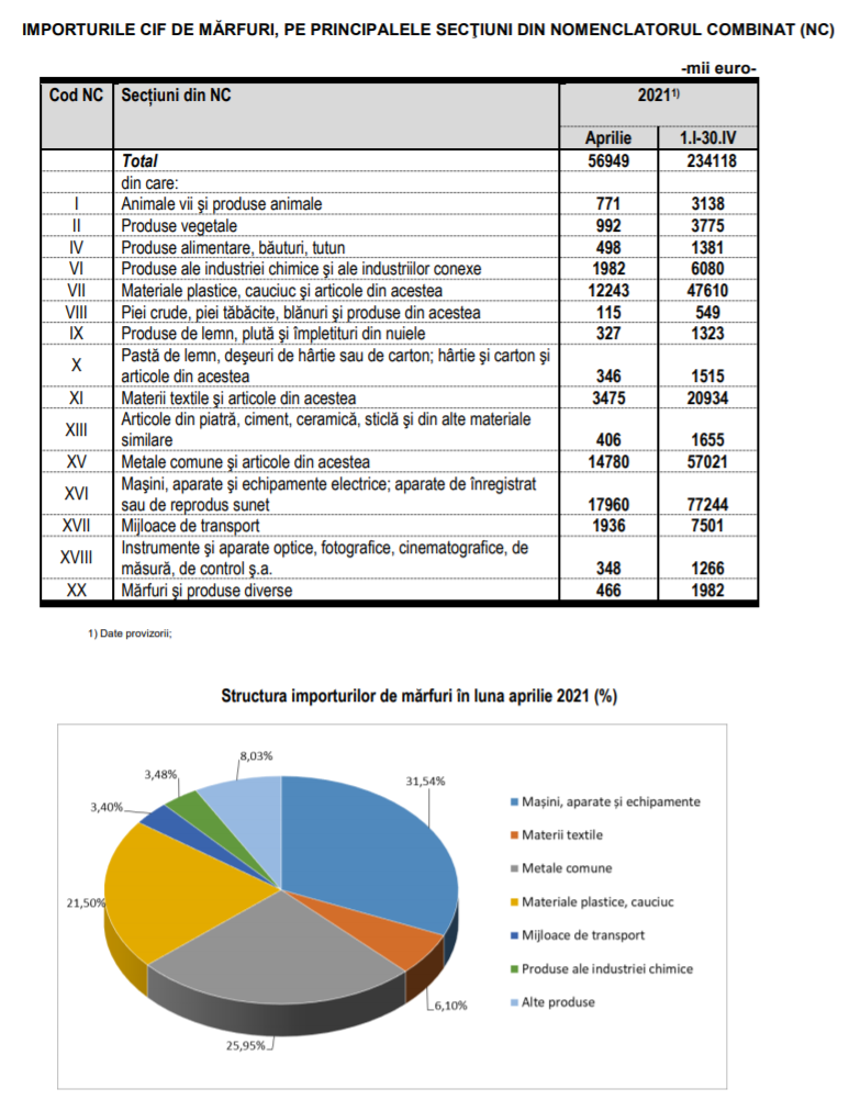 Referitor la importurile realizate de agenții economici din județ, în luna aprilie 2021, volumul acestora a fost de de 56,9 milioane euro, cu 232,4%