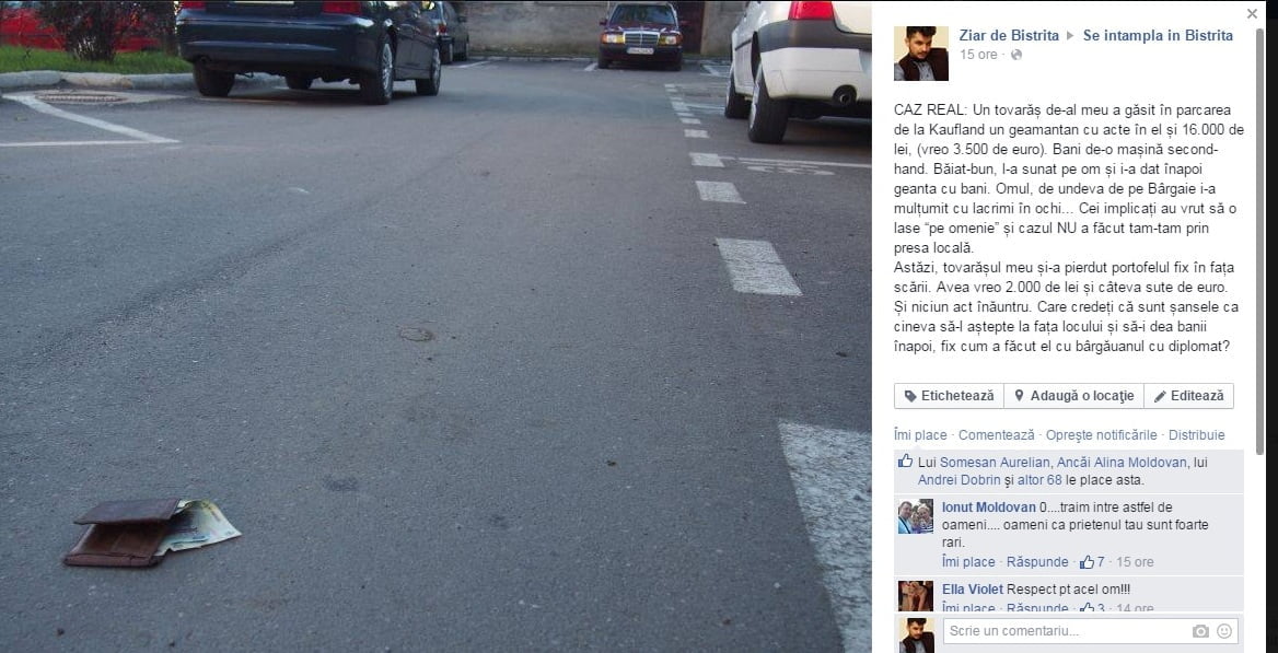 “CAZ REAL: Un tovarăș de-al meu a găsit în parcarea de la Kaufland un geamantan cu acte în el și 16.000 de lei, (vreo 3.500 de euro). Bani de-o mașină second-hand. Băiat-bun, l-a sunat pe om și i-a dat înapoi geanta cu bani. Omul, de undeva de pe Bârgaie i-a mulțumit cu lacrimi în ochi… Cei implicați au vrut să o lase “pe omenie” și cazul NU a făcut tam-tam prin presa locală.