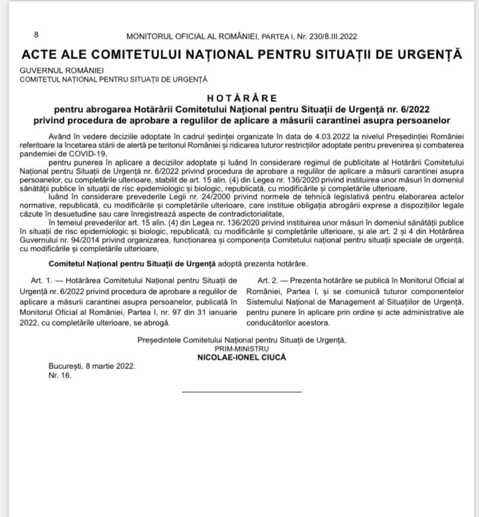 Astfel, prin HCNSU nr.16/2022 s-a decis abrogarea Hotărârii Comitetului Naţional pentru Situaţii de Urgenţă nr. 6/2022 privind procedura de aprobare a regulilor de aplicare a măsurii carantinei asupra persoanelor, publicată în Monitorul Oficial al României, Partea I, nr. 97 din 31 ianuarie 2022.