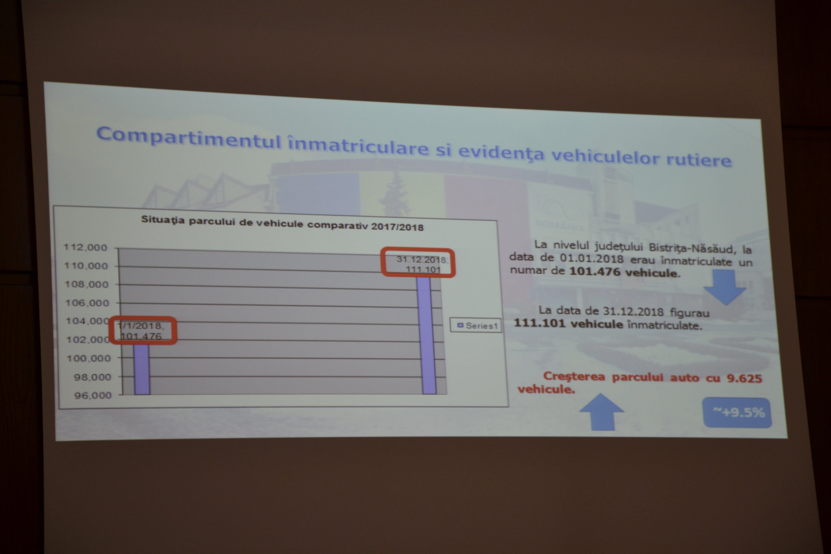 ”După cum vedeți, o creștere spectaculoasă de aproape 10 la sută, ceea ce e foarte mult pentru un județ așa mic cum e al nostru și iată explicația de ce suntem tot mai aglomerați și nu mai găsim locuri de parcare. Avem o creștere de 10 la sută într-un an” a declarat prefectul județului Bistrița-Năsăud, Ovidiu Victor Frenț, care a prezentat aceste date, miercuri, într-o ședință a Colegiului Prefectural Bistrița-Năsăud.