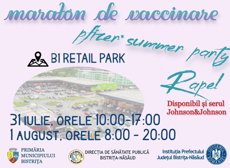 Totodată, în acest final de săptămână, în parcarea galeriei comerciale B1 Retail Park, va avea o nouă acțiune de vaccinare de tip Drive-Thru. Astfel, sâmbătă, între orele 10:00 și 16:30 și duminică, între orele 09:00 și 14:30, o echipă de vaccinare va administra serul Pfizer, de care pot beneficia persoanele cu vârsta minimă de 12 ani și serul Johnson&Johnson (doză unică, de care pot beneficia persoanele cu vârsta minima de 18 ani).