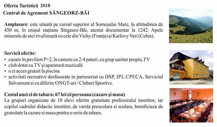 ”Pentru sezonul 2018 avem contractate un număr de 10 serii complete, respectiv 90 de tineri / serie, ceea ce reprezintă un număr maxim de 900 tineri, Centrul de Agrement Sîngeorz-Băi fiind ocupat la capacitatea maximă. Până în prezent s-a derulat prima serie de tabere cu un număr total de 120 tineri (Tabăra Națională de Arte Vizuale), urmând ca în luna august 2018 să se deruleze Tabăra Națională de Pregătire Militară, organizată în colaborare cu Garnizoana Bistrița, altă tabără cu tradiție în județul nostru” a precizat Anghel Zăpârțan într-o ședință a Colegiului Prefectural.