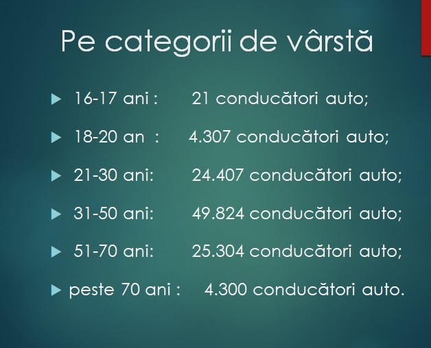 Alți circa 25.000 de șoferi au vârsta între 51 și 70 de ani, în vreme ce alți 24.000 au vârste între 21 și 30 de ani. Există și șoferi care au trecut deja de vârsta de 70 de ani și încă se urcă la volan (4.300), dar și șoferi începători, cu vârsta cuprinsă într 18 și 20 de ani (tot circa 4.300).