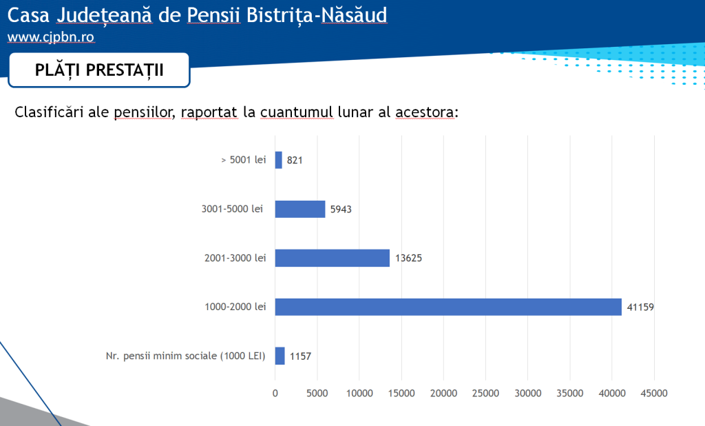 ”În ceea ce privește cuantumul lunar al pensiilor, am avut anul trecut în plată un număr de 821 de pensii care au fost mai mari de 5.000 de lei. Cele mai multe le avem între 1.000 și 2.000 de lei, respectiv 41.159”, a adăugat directorul Casei Județene de Pensii Bistrița-Năsăud.