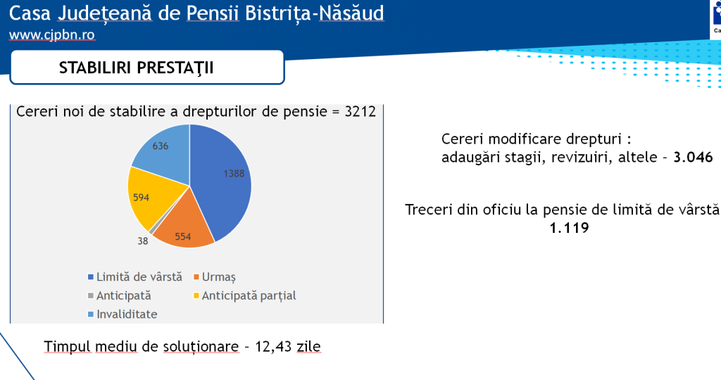 ”În anul 2022 am avut în lucru 3.212 cereri de stabilire a drepturilor noi de pensie și un număr de 3.046 de cereri de modificare drepturi, respectiv adăugare stagii, revizuiri sau alte solicitări. Timpul mediu de soluționare a cererilor a fost de 12,43 de zile. Noi timpul maxim îl avem de 45 de zile”, a explicat Sanda Vișan.