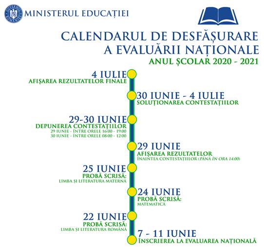 Ministerul Educației anunță că Evaluarea Națională pentru elevii claselor a VIII-a se va desfășura în perioada 22-25 iunie, reprezentând modalitatea de evaluare a competențelor dobândite pe parcursul învățământului gimnazial.