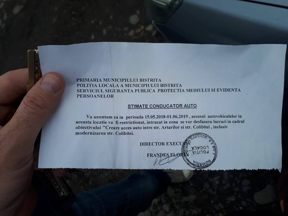 ”Vă anunțăm că în perioada 15.05.2018 – 01.06.2019, accesul autovehiculelor în această locație va fi restricționat, întrucât în zonă se vor desfășura lucrări în cadrul obiectivului ”Creare acces auto între strada Arțarilor și strada Colibiței, inclusiv modernizarea străzii Colibiței” anunță reprezentanții Primăriei Bistrița.