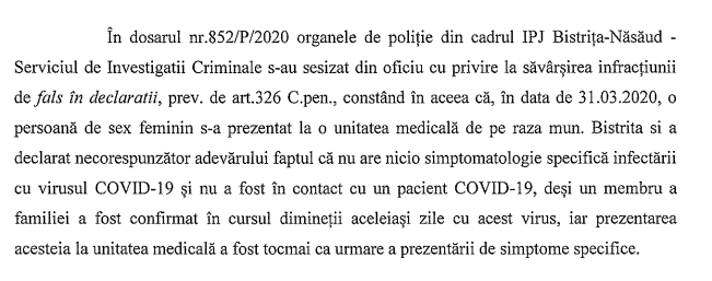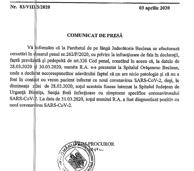 Astfel, s-a dispus efectuarea de cercetări după ce s-a constatat că ”la datele de 28.03.2020 și 30.03.2020, numita R.A. s-a prezentat la Spitalul Orășenesc Beclean, unde a declarat necorespunzător adevărului faptul că nu are nicio patologie și că nu a fost în contact cu niciun pacient infectat cu noul coronavirus, deși, în dimineața zilei de 28.03.3030, soțul femeii fusese internat la Spitalul Județean de Urgență Bistrița – Secția Boli Infecțioase cu simptome specifice coronavirusului SARS-COV-2. La data de 31.03.2020, soțul numitei R.A. A fost diagnosticat pozitiv cu noul coronavirus”, se arată într-un comunicat de presă al Parchetului de pe lângă Judecătoria Beclean.