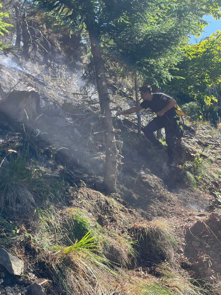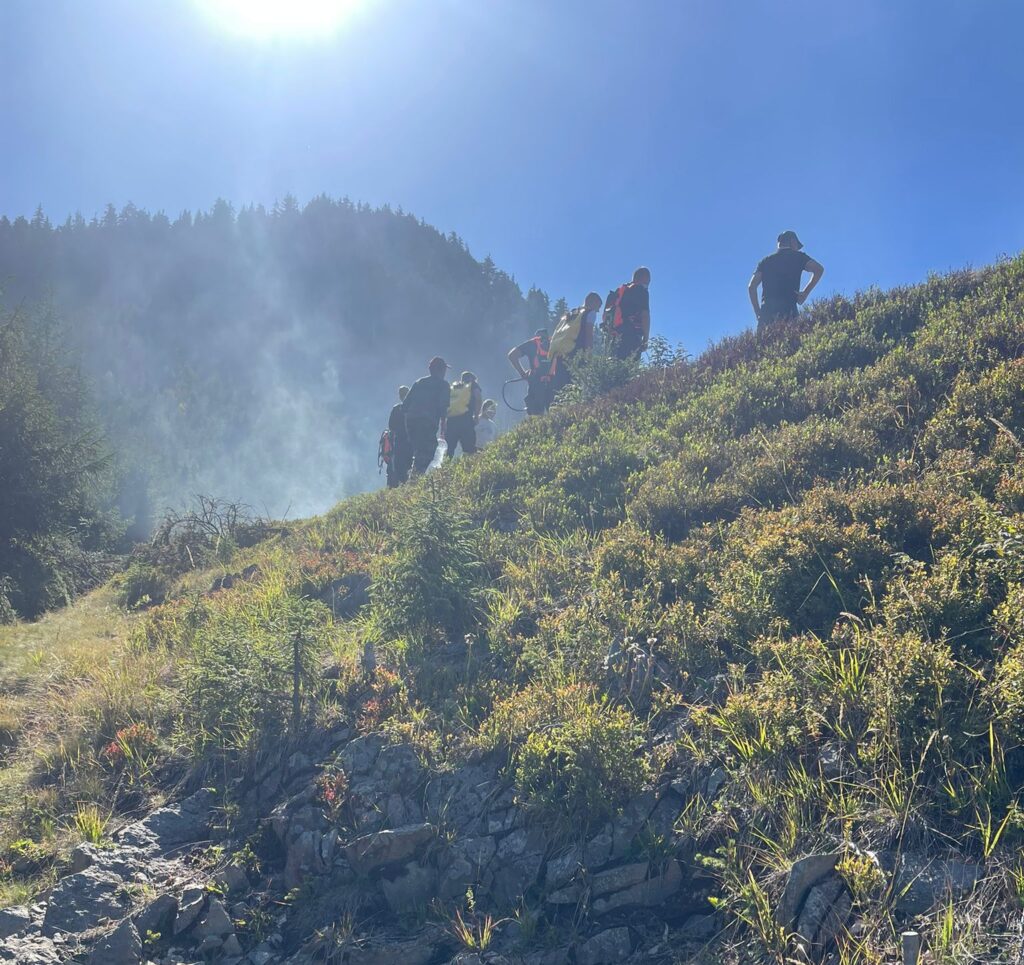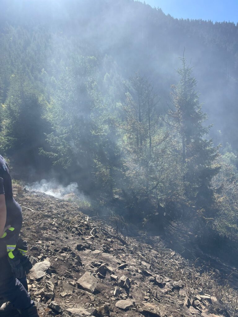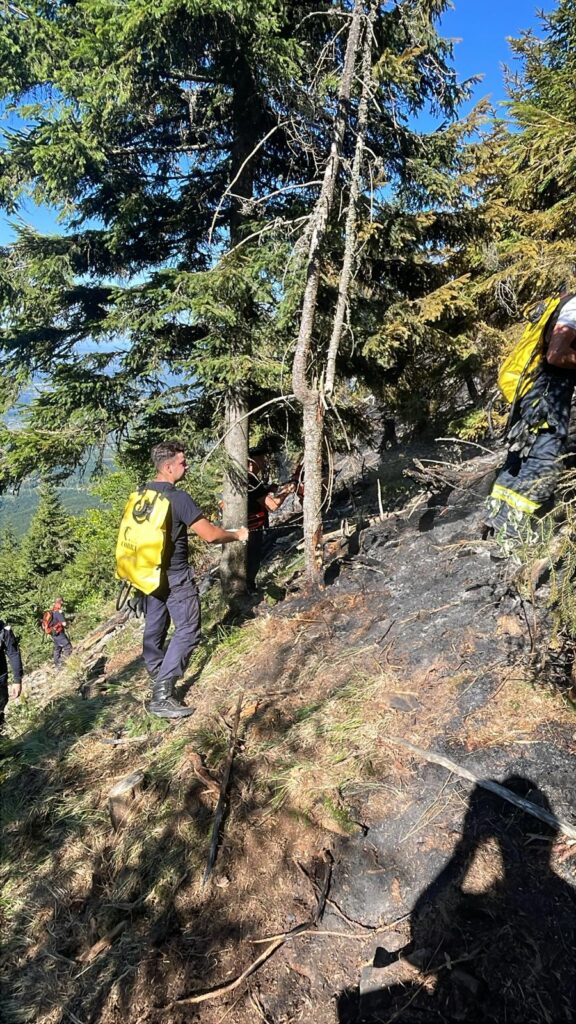 Echipele de intervenție acționează pentru limitarea propagării focului și lichidarea incendiului, fiind sprijinite de personal silvic cu experiență în teren montan.