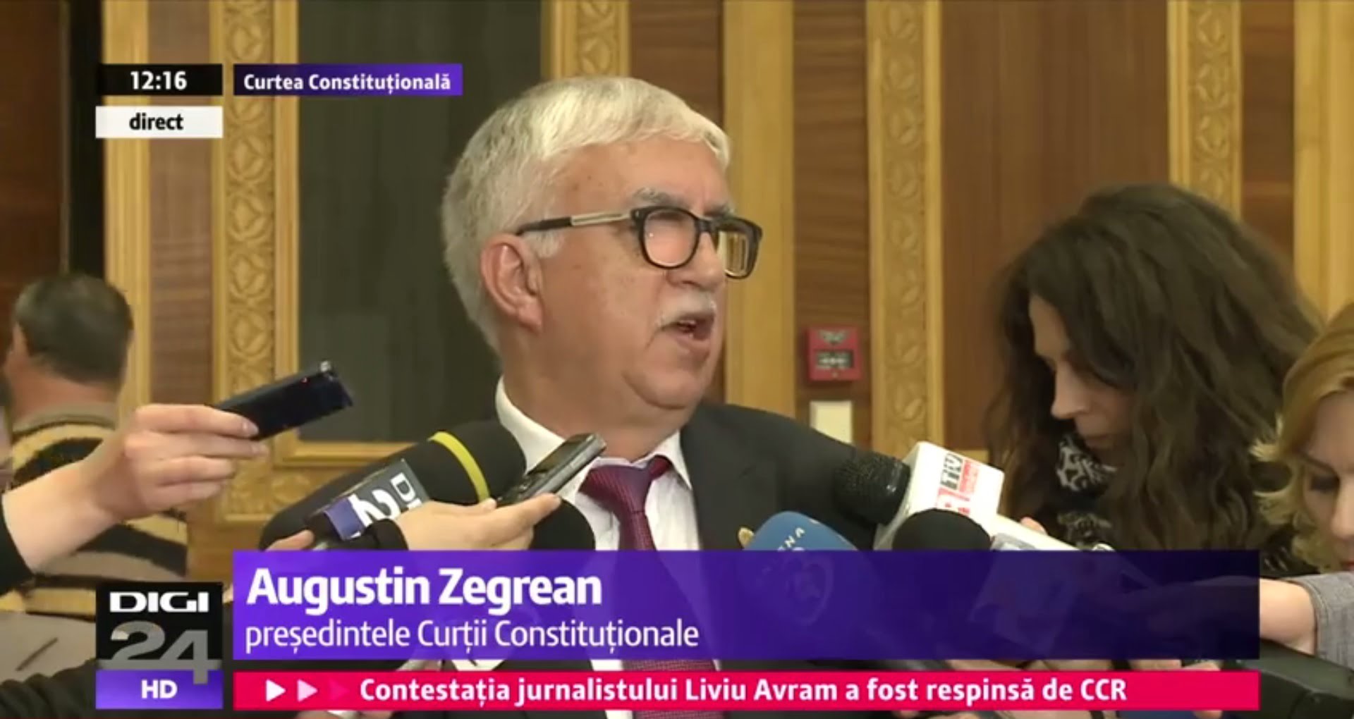 Augustin Zegrean: N-am avut nicio apăsare din cauza asta, pentru că nu am fost magistrat de carieră deşi mi-aş fi dorit asta, dar am fost avocat. Toată viaţa, de când am terminat facultatea, m-am ocupat cu asta. Nu am fost jurist consult la CAP, cum s-a spus. Asta este o invenţie, nu ştiu cine a inventat-o, dar chiar dacă aş fi fost, am cunoscut jurist consult de CAP foarte buni, am cunoscut un consilier care ştia carte cât mulţi alţi judecători la un loc. Nu are legătură faptul că ai fost judecător sau nu ai fost cu activitatea de aici. Chiar şi procedural vorbind, legea noastră spune că se aplică procedura cea stabilită de legea noastră şi doar se completează cu articole, cu procedura din Codul de procedură civilă, şi Curtea este cea care-şi stabileşte ce anume din Codul de procedura civilă se aplică şi ce nu, şi competenţa şi-o stabileşte Curtea, şi nimeni nu o poate cenzura.