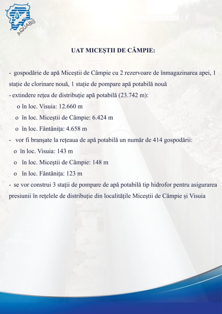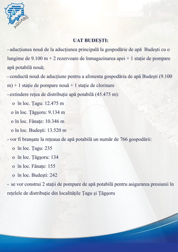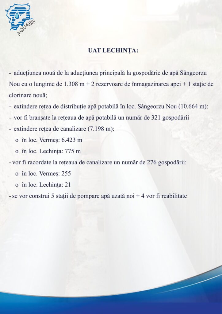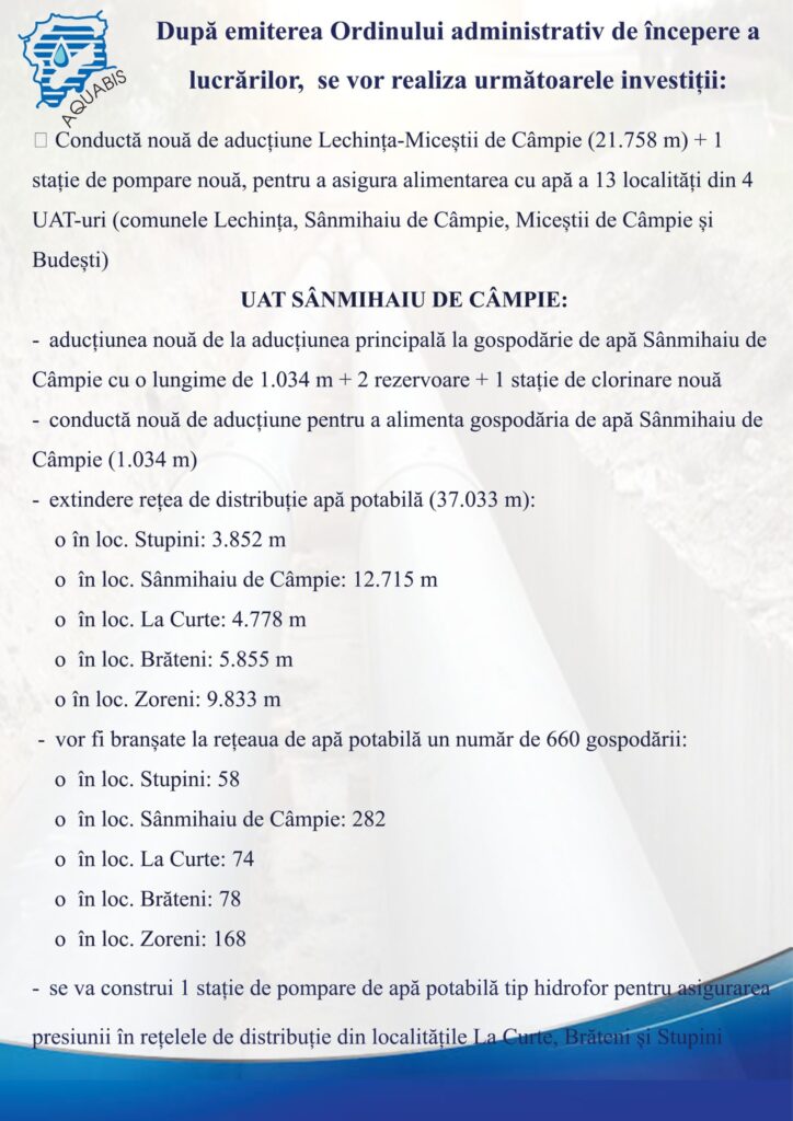 ”Pentru a ajunge cu apă în localitățile amintite, va trebui să facem aducțiuni. Din Lechința, din intersecția unde este cuplat Mateiul se va pleca cu o aducțiune spre Sânmihaiu de Câmpie – Miceștii de Câmpie, 21,8 km aducțiune. Pe urmă, spre Sângeorzu Nou mai avem o aducțiune de 1,3 km din aceeași aducțiuni de care spuneam mai înainte. Spre Budești mai avem încă 1,9 km de aducțiune și avem la Sânmihaiu de Câmpie 1,034 km tot aducțiune. Vom avea în toate localitățile câte două rezervoare de apă de 100 – 150 de metri cubi, după caz și după necesarul de consum din fiecare localitate. Mai avem distribuții pe toate localitățile, cu branșamente executate până la limita de proprietate cămin-apometru. Discutăm de zeci de km rețele de distribuție pentru că știm că localitățile respective se întind pe suprafețe destul de mari și sunt mai multe sate componente. Pe lângă alimentarea cu apă în Sânmihaiu de Câmpie, Miceștii de Câmpie și Budești, în Lechința avem și canalizare de executat: 7,2 km conducte de canal, 793 de cămine, stații de pompare apă uzată. Va fi o lucrare destul de complexă, care include atât aducțiuni, cât și distribuții, rezervoare, stații de pompe. Nu va fi ușor pentru constructor pentru că va trebui să mobilizeze foarte multe echipe, fiind vorba de o lungime atât de mare pentru rețele și branșamente. De asemenea, termenul este destul de strâns, de doar doi ani. Dar discutăm totuși de un constructor cu potențial. Și pentru el, și pentru noi este un început pentru că nu am mai lucrat până acum pe programe de acest gen, dar eu zic că acest constructor se va descurca pentru că are destule lucrări executate pe partea de alimentare cu apă și canalizare”, a adăugat Ion Șandru.