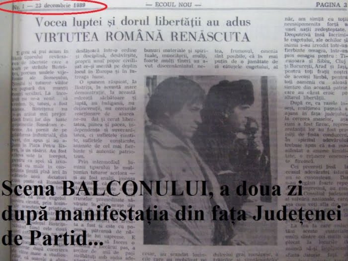 În balconul județenei de partid ne aflam : subsemnatul, Chereji Florin, Bența Ioan, Carbunaru Vasile și două doamne. Primul secretar de atunci, Letiția Ionaș a încercat să conducă și să calmeze mulțimea. A fost huiduită ! A încercat apoi, primarul orașului Bistrița, Nicolae Lupsan . N-a reuşit nici el! I-am cerut eu microfonul primarului Lupsan. Cu greu mi l-a dat. Am condamnat public și pentru prima dată după 45 de ani, comunismul ca sistem, arătând faptul că este o doctrină refuzată de istorie, bazată pe crime împotriva umanităţii şi impusă poporului nostru cu ajutorul tancurilor sovietice. Nu cred că la acea oră mai vorbea cineva în ţara în balconul judeţenei de partid cu Ceauşescu în funcţie.