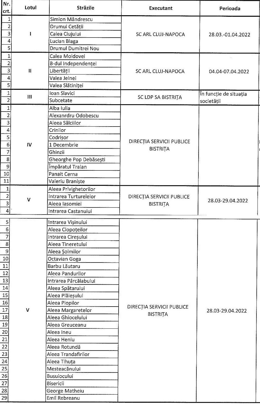Programul de reparații pe străzile din municipiul Bistrița a început la data de 28 martie, intervențiile fiind împărțite pe mai multe loturi. Lucrările se desfășoară după următorul program: