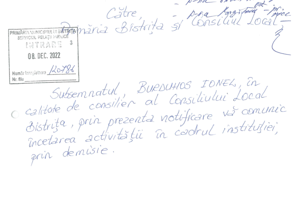 Joi, 8 decembrie, acesta a înaintat Primăriei Bistrița demisia din funcția de consilier local: