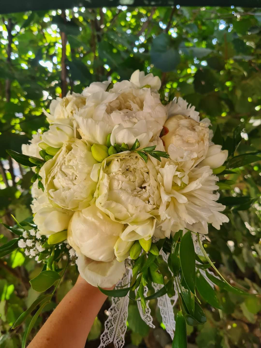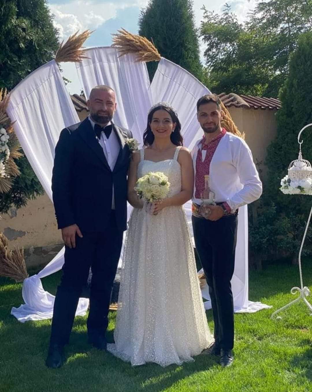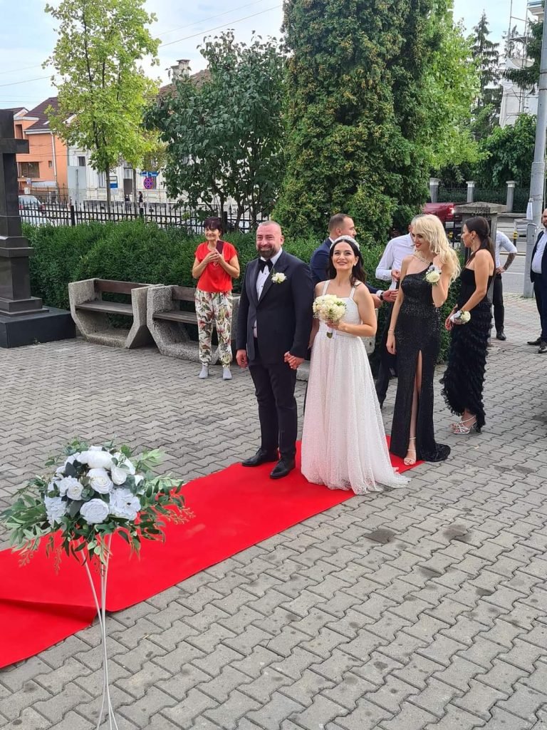 Mireasa Antonia a ales o ținută de prințesă, o rochie clasică, crem cu broderie și strasuri. Buchetul special, cu bujori albi și diadema i-au completat look-ul special. Ionel Burduhos a preferat un costum negru, clasic, cu papion și astfel, ținutele s-au asortat perefect!
