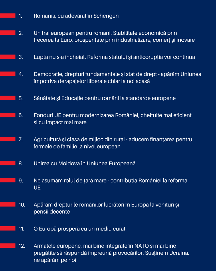 Dintre acestea, pe primul loc se află susţinerea aderării României la Schengen, menţionându-se că Guvernarea PSD-PNL „a obţinut un eşec” din acest punct de vedere şi că România nu va fi cu adevărat parte a zonei Schengen decât atunci când va intra şi cu frontierele terestre.