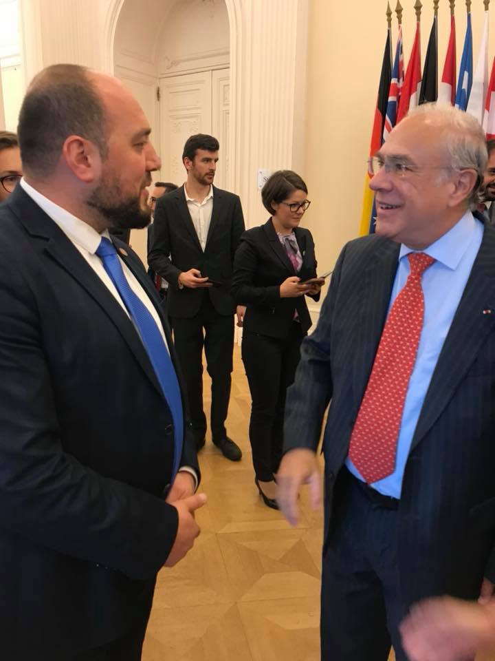 „Am avut onoarea să particip, în zilele de 18 și 19 septembrie, la Paris, la discuții pe tema „Schimbări tectonice ale mediului politic european? Poziția strategică a centrului politic al Europei”, organizată de Forumul Tinerilor Parlamentari. Astăzi am fost primiți de José Ángel Gurría, secretarul general al OECD, de Valéry Giscard d’Estaing, fost președinte al Franței, precum și de Brune Poirson, ministru pentru Ecologie și Tranziție Inclusivă în Franța.