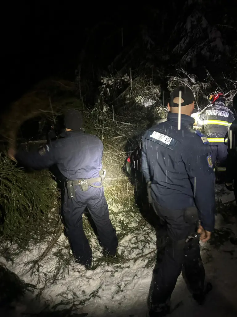 În minivacanța de Crăciun, jandarmii montani din Rodna și Colibița au acordat sprijin pompierilor pentru deblocarea unor drumuri care au fost blocate de arbori doborâți de vânt și care asigurau accesul spre pensiunile din zonă.