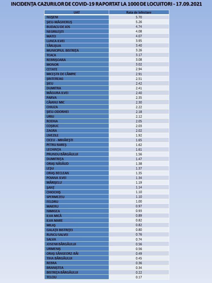 Județul Bistrița-Năsăud se află pe locul trei la nivel național în ceea ce privește rata de infectare cu virusul SARS-CoV-2, pe primele locuri situându-se județele Satu Mare – 2,91 și Ilfov – 2,37.