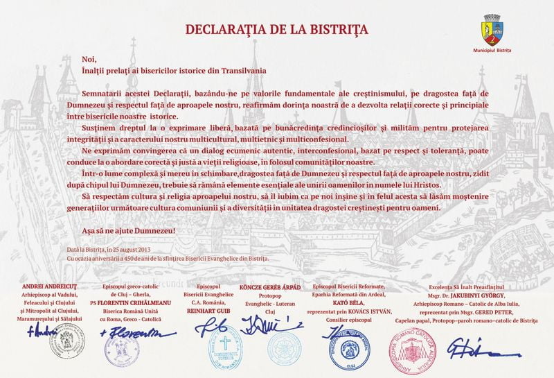 ”Noi, înalţii prelaţi ai bisericilor istorice din Transilvania, semnatarii acestei declaraţii, bazându-ne pe valorile fundamentale ale creştinismului, pe dragostea faţă de Dumnezeu şi respectul faţă de aproapele nostru, reafirmăm dorinţa noastră de a dezvolta relaţii corecte şi principiale între bisericile noastre istorice. Susţinem dreptul la o exprimare liberă, bazată pe bună credinţă, şi milităm pentru protejarea integrităţii şi a caracterului nostru multicultural, multietnic şi multiconfesional. Ne exprimăm convingerea că un dialog ecumenic autentic interconfesional bazat pe respect şi toleranţă poate conduce la o abordare corectă şi justă a vieţii religioase în folosul comunităţilor noastre.”