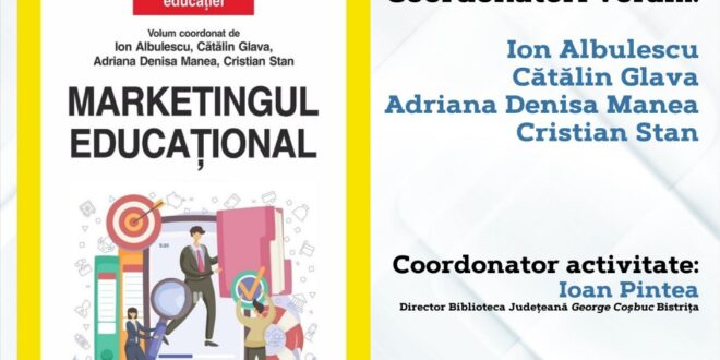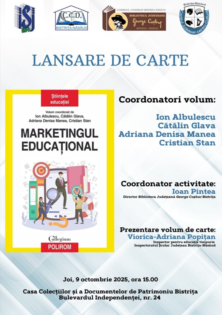 Inspectoratul Școlar Județean Bistrița-Năsăud, Casa Corpului Didactic Bistrița-Năsăud, Consiliul Județean Bistrița-Năsăud, Biblioteca Județeană ”George Coșbuc” și Centrul Județean pentru Cultură Bistrița-Năsăud anunță lansarea, la Bistrița, a volumului ”Marketingul educațional”, coordonat de Ion Albulescu, Cătălin Glava, Adriana Denisa Manea și Cristian Stan.