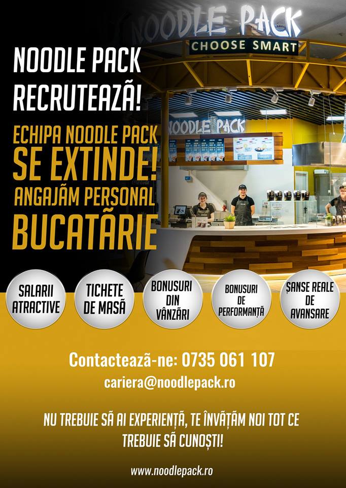 ”Angajăm personal bucătărie și casieri în Bistrița. Salariul 1.400 de lei + bonusuri din vânzări + bonusuri de performanță + transport gratuit” anunță reprezentanții Noodle Pack.
