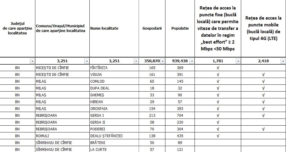 ”Cele 3.251 de localități din lista „zonelor albe NGN” conțin 350.870 de gospodării și au o populație totală de 939.438 de locuitori (potrivit datelor Institutului Național de Statistică de la cel mai recent recensământ al populației, din 2011). Din cele 3.251 de localități, 1.781 figurează ca fiind deservite de o rețea de comunicații electronice la puncte fixe care poate asigura conexiuni cu viteze de transfer a datelor (download) în regim „best effort” de minim 2 Mbps, dar nu mai mult de 30 Mbps, iar un număr de 2.418 figurează ca fiind deservite de cel puțin o rețea de acces la puncte mobile de tipul 4G (LTE). Unele dintre aceste localități ar putea face obiectul unei scheme de ajutor de stat din partea MCSI, astfel încât să devină deservite de rețele cu viteze de 30 Mbps sau mai mari” informează ANCOM.