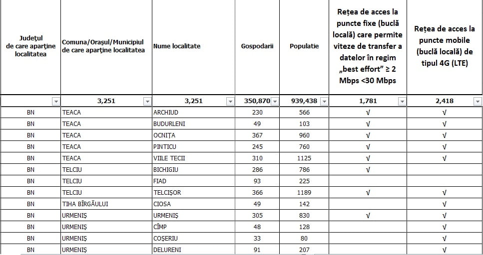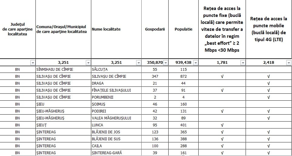 Lista privind 3.251 de localități cu aproximativ 930.000 de locuitori a fost făcută publică de Autoritatea Naţională pentru Administrare şi Reglementare în Comunicaţii (ANCOM) și cuprinde și circa 50 de localități din județul Bistrița-Năsăud. Cu toate că unele localități sunt deservite de rețele fixe sau mobile, acestea nu pot oferi însă vitezele minime specificate.