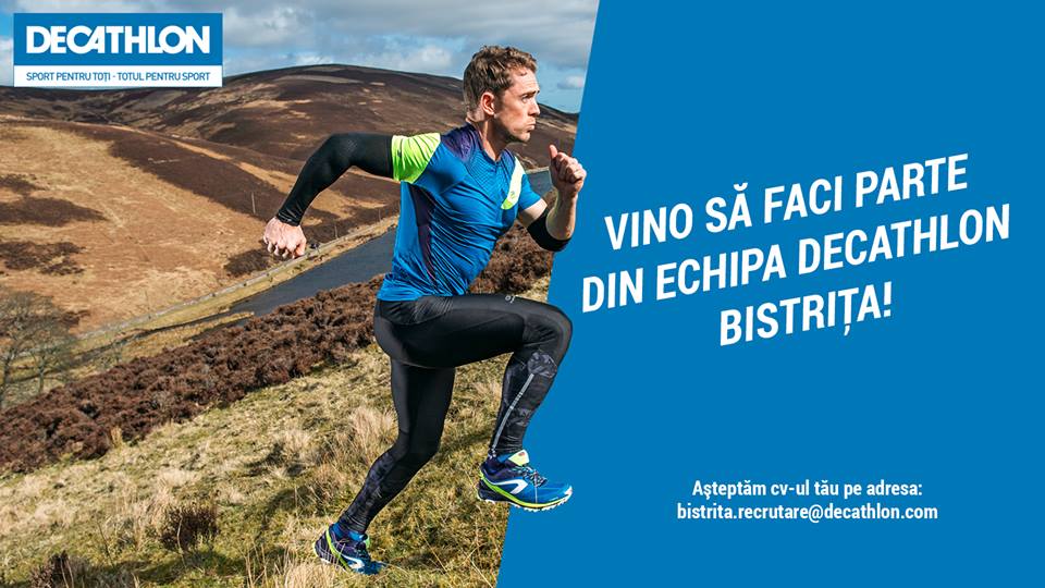 ”Facem sportul accesibil venind tot mai aproape de utilizatorii sportivi din întreaga ţară! In curând, și în orașul tău! Vrei să faci parte dintr-o echipă de sportivi pasionați? Atunci trimite cv-ul tău pe adresa: bistrita.recrutare@decathl