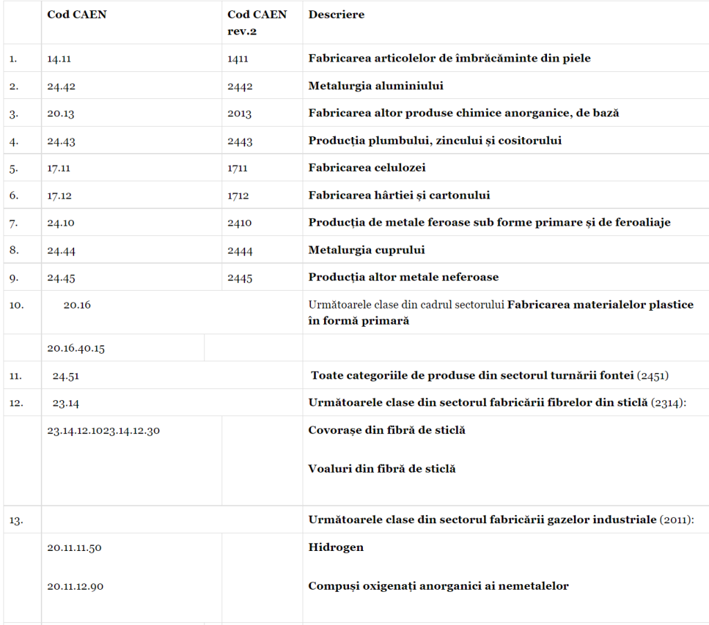Beneficiarii ajutorului de stat au fost consumatorii energointensivi cu activitate în domeniul pregătirii fibrelor și filării fibrelor textile, fabricarea articolelor de îmbrăcăminte din piele, fabricarea hârtiei și a cartonului, extracția de minereuri feroase, extracția mineralelor pentru industria chimică și a îngrășămintelor naturale, fabricarea produselor de cocserie, fabricarea altlor produse chimice anorganice de bază, fabricarea îngrășămintelor și produselor azotoase, fabricarea fibrelor sintetice și artificiale, producția de metale feroase, sub forme primare, și de feroaliaje, metalurgia aluminiului, producția plumbului, zincului și cositorului, metalurgia cuprului.