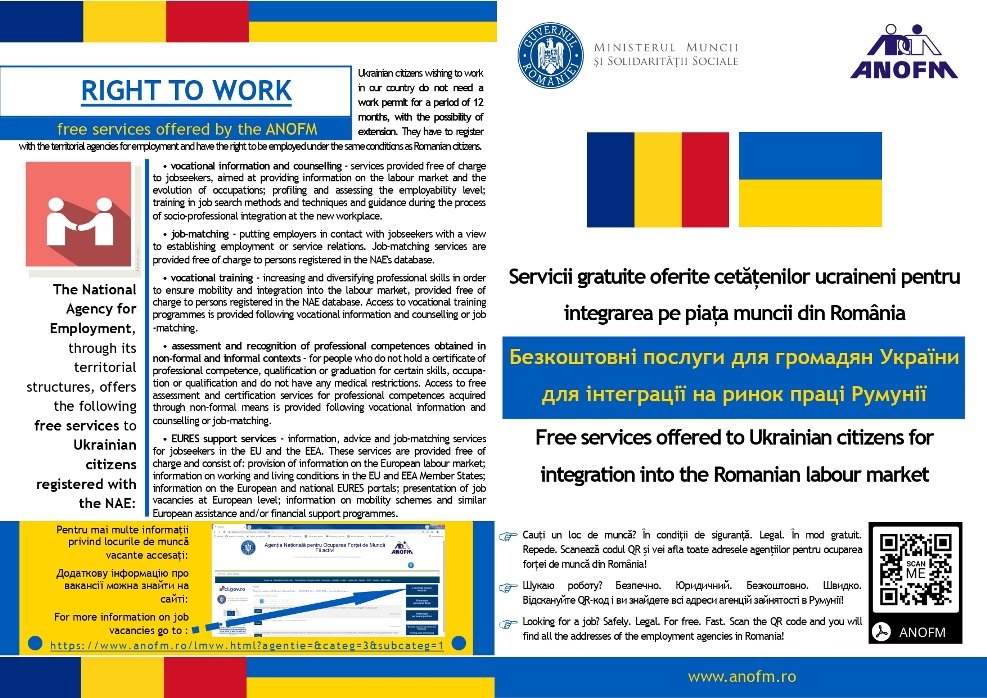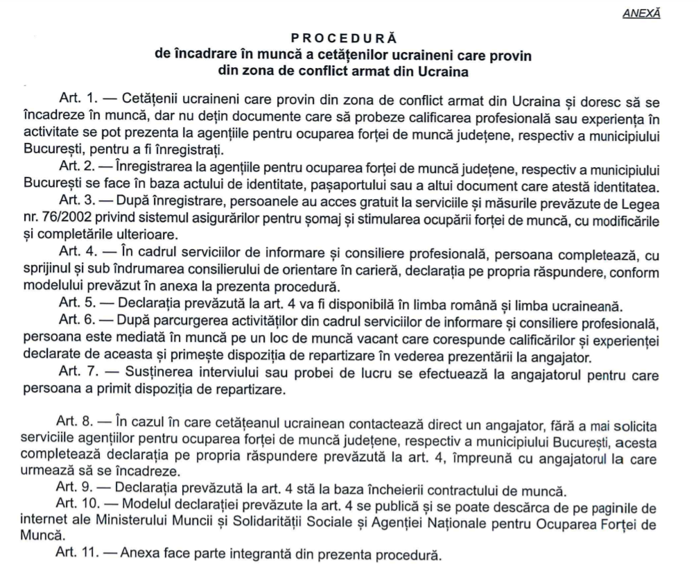 Ministerul Muncii și Solidarității Sociale a aprobat procedura de încadrare în muncă a cetățenilor care provin din zona de conflict armat din Ucraina și propune o serie de soluții pentru facilitarea accesului cetățenilor ucraineni pe piața muncii din România, prin crearea cadrului necesar pentru ca aceștia să-și poată asigura o sursă de venit din munca prestată.