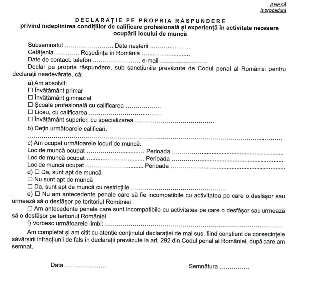 În cadrul serviciilor de informare şi consiliere profesională, persoana completează, cu sprijinul şi sub îndrumarea consilierului de orientare în carieră, o declaraţie pe proprie răspundere (model tipizat) privind îndeplinirea condiţiilor de calificare profesională şi experienţă în activitate, disponibilă în limba română şi limba ucraineană.