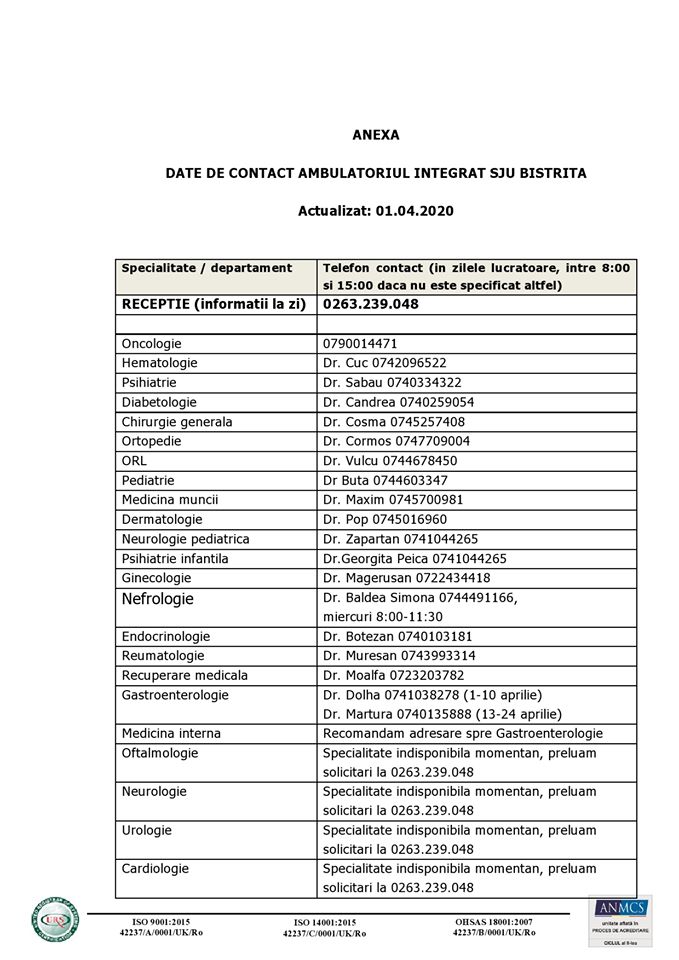 ”Facem eforturi pentru a păstra cât mai multe cabinete deschise în această perioadă, dar suntem implicați și în asigurarea serviciilor medicale din cadrul secțiilor cu paturi ale SJU Bistrița. De aceea, anumite specialități pot fi temporar indisponibile. Preluăm solicitările dumneavoastră și încercăm ca pe viitor să asigurăm consultații pentru toate specialitățile”, a precizat medicul coordonator al Ambulatoriului Integrat al SJU Bistrița, dr. Ștefan Pop.