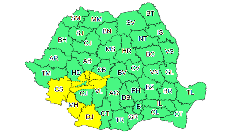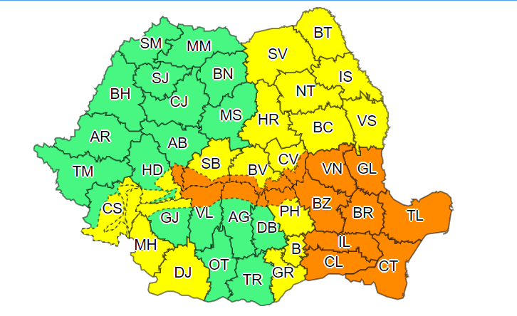 La nivel național, Administrația Națională de Meteorologie a emis mai multe avertizări valabile în acest final de săptămână în mai multe județe din țară.