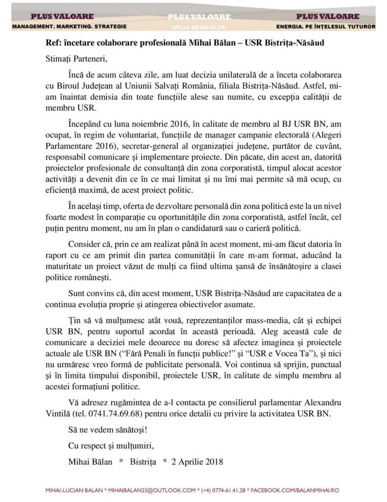 Secretarul general al organizației județene a USR Bistrița-Năsăud renunță la funcția de la vârful organizației! Mihai Bălan a transmis presei motivele pentru care renunță la implicarea în organizarea partidului. Mihai Bălan a coordonat campania parlamentară din 2016 și a fost purtător de cuvânt al organizației. Bălan NU renunță la calitatea de membru al USR… dar susține că se va concentra pe zona corporatistă!
