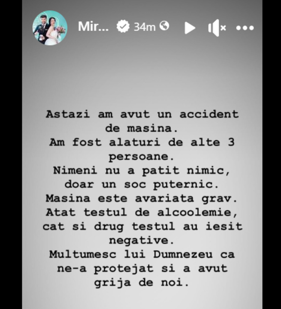Într-o postare pe o rețea de socializare, vloggerul confirmă că a fost implicat într-un accident și precizează că alături de el în mașină se mai aflau încă trei persoane.